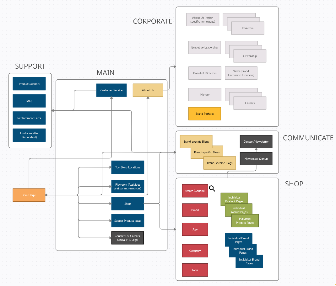 Some comparative IA diagrams for websites selling educational toys. Developed as a compliment to a card-sorting study.